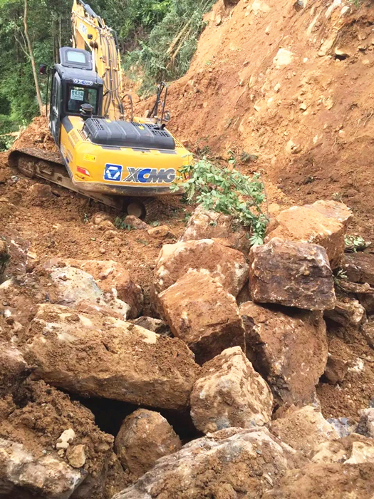 7月13日早7點(diǎn),響徹云霄的鞭炮聲過后,所有機(jī)械開始作業(yè)。挖掘機(jī)工作7小時(shí)推進(jìn)到6米的時(shí)候,山體出現(xiàn)了滑坡,好在提前做了排險(xiǎn)處理,未出現(xiàn)任何施工事故。道路基線均處在滑坡地帶、山體內(nèi)所含石料60%為整石、40%為孤石含雜松軟黏土,這為施工帶來了很大難度,工作進(jìn)度也非常緩慢,到了晚上22點(diǎn),道路才勉強(qiáng)推進(jìn)到9米。