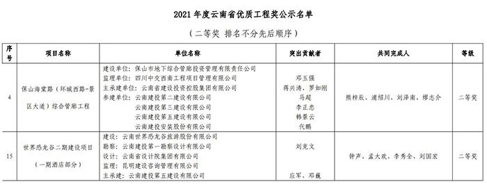 近日,云南省建筑業(yè)協(xié)會(huì)公布了2021年度云南省優(yōu)質(zhì)工程獲獎(jiǎng)名單,公司承建的保山海棠路(環(huán)城西路-景區(qū)大道)綜合管廊工程、世界恐龍谷二期建設(shè)項(xiàng)目(一期酒店部分)2個(gè)項(xiàng)目榮獲二等獎(jiǎng)。