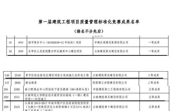 近日,中國建筑業(yè)協(xié)會(huì)質(zhì)量管理與監(jiān)督檢測分會(huì)公布了第一屆建筑工程項(xiàng)目質(zhì)量管理標(biāo)準(zhǔn)化競賽的成果名單。公司參評的五華區(qū)人民醫(yī)院暨五華區(qū)康養(yǎng)中心建設(shè)項(xiàng)目獲一等成果、晉寧區(qū)安企居住區(qū)建設(shè)項(xiàng)目E地塊施工總承包工程獲二等成果,云南師范大學(xué)職業(yè)技術(shù)教育實(shí)訓(xùn)基地(一期)建設(shè)項(xiàng)目-一標(biāo)段施工獲三等成果。