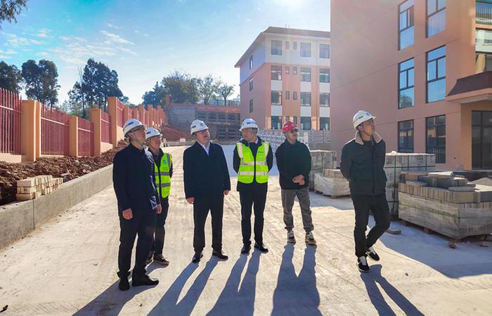 在石林民族中學(xué)項(xiàng)目,蔣璽實(shí)地查看項(xiàng)目現(xiàn)場(chǎng),詳細(xì)了解項(xiàng)目當(dāng)前開展情況及一線職工生活狀況,對(duì)項(xiàng)目進(jìn)度、成本、安全、質(zhì)量管控等方面工作進(jìn)行指導(dǎo)。