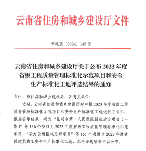 近日,云南省住房和城鄉(xiāng)建設(shè)廳揭曉了“2023年度省級(jí)工程質(zhì)量管理標(biāo)準(zhǔn)化示范項(xiàng)目和安全生產(chǎn)標(biāo)準(zhǔn)化工地”的評(píng)選結(jié)果,由公司第七直管項(xiàng)目部負(fù)責(zé)施工的云南藝術(shù)學(xué)院二期工程藝術(shù)實(shí)踐中心(含1#、2#、3#及5#、6#教學(xué)樓建設(shè)項(xiàng)目)、五〇八直管項(xiàng)目部負(fù)責(zé)施工的云南省婦女兒童發(fā)展中心建設(shè)項(xiàng)目及第二直管項(xiàng)目部負(fù)責(zé)施工的個(gè)舊市工人療養(yǎng)院提升改造項(xiàng)目榮獲2023年度省級(jí)安全質(zhì)量“雙標(biāo)化”示范項(xiàng)目殊榮。