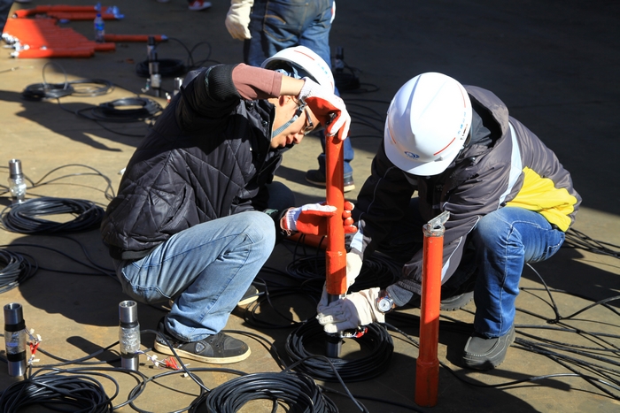 “15MPA、18MPA、21MPA……”2013年1月17日,云南大力神鋼結(jié)構(gòu)廠區(qū)內(nèi)傳來(lái)了一個(gè)儀器讀數(shù)的聲音,一群五建人雙眼緊盯著一個(gè)輪扣架體,神情緊張卻又充滿期盼, 600KN壓力試驗(yàn)機(jī)儀表指針不停地的轉(zhuǎn)動(dòng)著,“砰”的一聲,儀表指針飄過(guò)24MPA旋即回到零位,場(chǎng)地上的人好似卸掉重負(fù)一般歡欣起來(lái):“輪扣壓力試驗(yàn)成功了!”