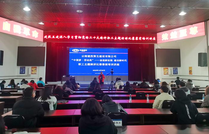 12月6日下午,公司工會(huì)以《“中國夢(mèng)·勞動(dòng)美”——奮進(jìn)新征程?建功新時(shí)代》為主題的深入學(xué)習(xí)貫徹黨的二十大精神職工主題演講比賽賽前培訓(xùn)講座在公司禮堂順利開展。各基層單位參加演講比賽的選手、工會(huì)主席、工會(huì)干事以及熱愛演講的職工同志等60余名干部職工參加線下培訓(xùn),培訓(xùn)同時(shí)通過“云南建投第五建設(shè)有限公司”釘釘群進(jìn)行實(shí)時(shí)直播,200余名干部職工同步參加此次線上培訓(xùn)。本次培訓(xùn)特別邀請(qǐng)到云南演講學(xué)會(huì)副會(huì)長徐俊波…