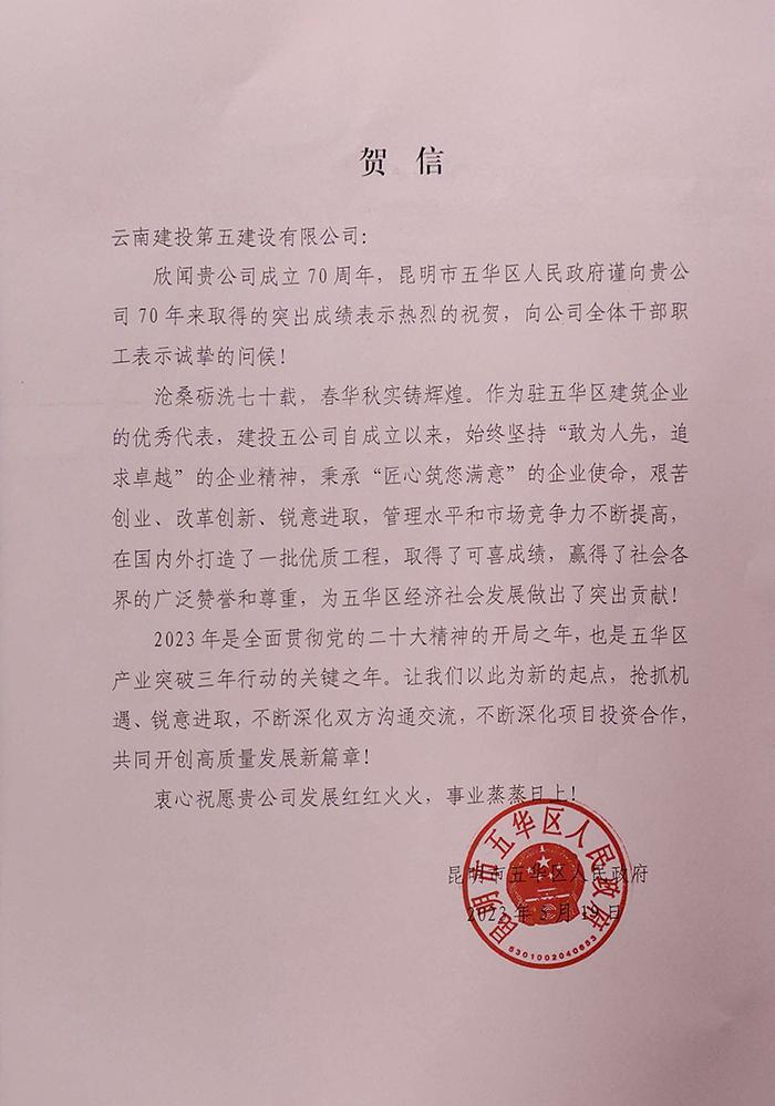 公司建司70周年之際,五華區(qū)人民政府送來賀信,向公司70年來取得的成績表示祝賀,向公司全體干部職工表示問候。
