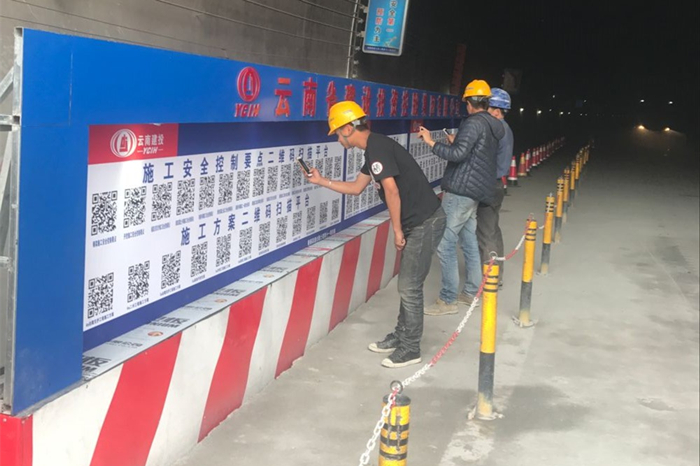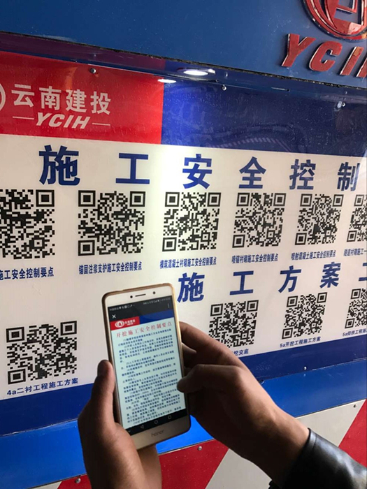 二維碼掃描平臺位于古那灣2號隧道進口端洞外的休息區(qū)及洞口人車分流區(qū)的人行道上,涵蓋施工安全控制要點、施工方案、作業(yè)指導(dǎo)書、安全技術(shù)交底、安全操作規(guī)程等施工工藝、規(guī)范和安全、技術(shù)、質(zhì)量管理內(nèi)容。進入施工現(xiàn)場前如需查詢相關(guān)資料,可直接通過手機掃描二維碼進行查詢,操作非常方便。就算施工員不小心忘記了施工技術(shù)交底中的某個數(shù)據(jù),只要輕松掃一掃就能全部“收入囊中”,巧當(dāng)施工現(xiàn)場的“教科書”。