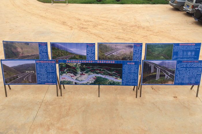 該效果圖展板包括標(biāo)段總平面圖、標(biāo)段內(nèi)控制性工程古那灣連續(xù)剛構(gòu)橋、松園橋互通立交及連接線、古那灣2號隧道及忠義3號大橋、兩家村1號大橋、兩家村2號大橋、兩家村3號大橋共計7幅。