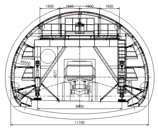 二襯臺車主要由模板總成、頂模架體、平移機構(gòu)總成、門架總成、主從行走機構(gòu)、絲杠千斤頂、液壓系統(tǒng)、電氣系統(tǒng)等組成。臺架采用裝載機和挖掘機配合安裝,模板安裝時,主要使用挖掘機配合人工進(jìn)行安裝。二襯臺車用于對隧道內(nèi)壁的二襯砼襯砌施工,也是隧道施工過程二次襯砌中必須使用的專用設(shè)備。當(dāng)隧道掌子面(左右洞)施工達(dá)到80米后,在洞口處拼裝二襯臺車。