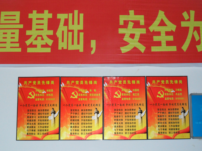 活動(dòng)提出“讓身份亮起來(lái),讓旗幟樹(shù)起來(lái)”。為此,黨支部制作了“共產(chǎn)黨員先鋒崗”標(biāo)牌,標(biāo)牌上標(biāo)注姓名、職務(wù)崗位、監(jiān)督電話,標(biāo)牌掛在科室辦公室、項(xiàng)目部辦公室的醒目位置,接受群眾職工監(jiān)督。