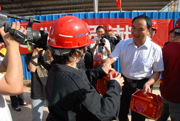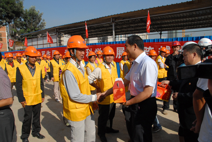 技術(shù)支持: 方森科技 2010年9月19日上午,在中秋節(jié)、國(guó)慶節(jié)來(lái)臨之際,昆明市總工會(huì)主席戚永宏率市總工會(huì)領(lǐng)導(dǎo)班子一行來(lái)到公司直五部施工的昆明市新工人文化宮建設(shè)工地慰問(wèn)正在施工的公司職工和農(nóng)民工,為他們每人帶去了一盒月餅。戚永宏說(shuō):“大家辛苦了,祝大家節(jié)日快樂(lè)?!?BR> 五公司副總經(jīng)理李興奎代表施工單位對(duì)他們的到來(lái)和關(guān)心表示歡迎和感謝。他說(shuō):“多年來(lái),公司創(chuàng)造了5項(xiàng)魯班獎(jiǎng),承建了省內(nèi)多項(xiàng)重點(diǎn)工程、市內(nèi)多項(xiàng)地標(biāo)性建筑。去年,公司簽訂工程合同額30億元,完成施工產(chǎn)值18億元,是各位領(lǐng)導(dǎo)關(guān)心、支持的結(jié)果。按建工集團(tuán)要求,今年公司承接任務(wù)要達(dá)到35億元,完成施工產(chǎn)值25億元,公司將不斷強(qiáng)化質(zhì)量、安全、文明施工管理,參與昆明市“四創(chuàng)兩爭(zhēng)”活動(dòng),支持新昆明的建設(shè),為昆明市的經(jīng)濟(jì)發(fā)展作出應(yīng)有的貢獻(xiàn)。”對(duì)于昆明市新工人文化宮項(xiàng)目,他強(qiáng)調(diào)“公司將與設(shè)計(jì)、監(jiān)理各單位密切配合,盡快掀起施工熱潮,嚴(yán)格管理,精心施工,重合同,講誠(chéng)信,按期完成施工任務(wù)?!?BR> 戚永宏一行還到施工現(xiàn)場(chǎng)了解項(xiàng)目的具體施工情況,與項(xiàng)目建設(shè)者們親切交談。